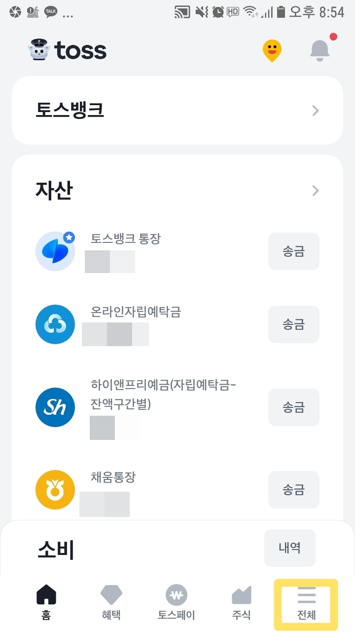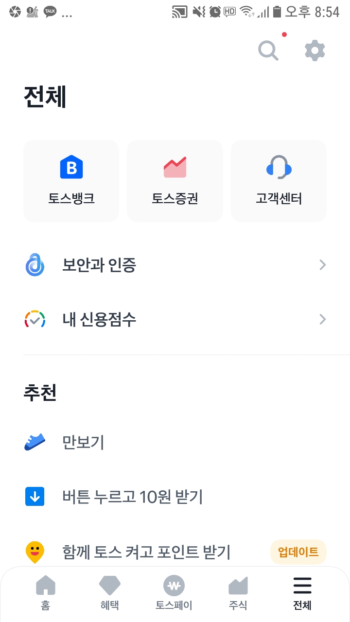그럼 토스에 있는 모든 메뉴들이 나열되는데요. 화면을 아래로 내려줍니다.