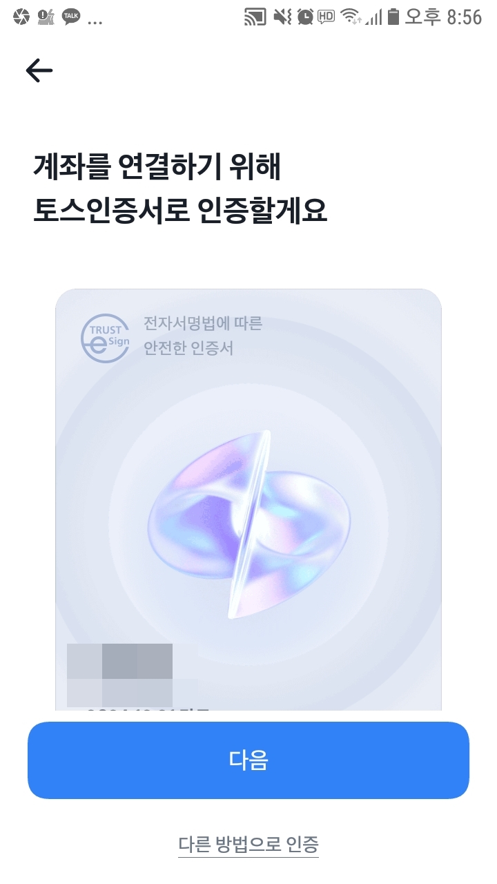 그 다음은 인증 작업을 진행해야합니다. 인증은 토스인증서를 통해 진행하면 빠르게 바로 진행할 수 있습니다. 만약 토스 인증서 말고 다른 방법으로 진행하고 싶으시다면 다른방법으로 인증을 클릭해서 진행하면 됩니다.