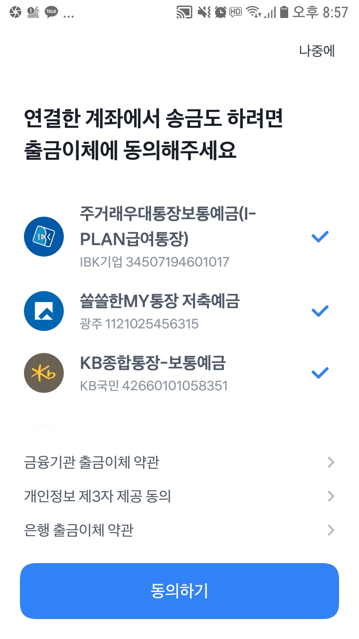 단순히 계좌의 잔액만 확인하는게 아니라 돈을 찾고 싶으신거라면 출금이체에 동의하셔야 합니다. 동의하기 버튼을 클릭해 줍니다.